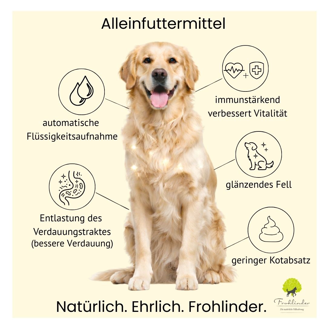 Wie alle Frohlinder Sorten wird auch Flora aus frischen, natürlichen Zutaten hergestellt – ohne Konservierungsstoffe, Lockstoffe oder künstliche Zusätze. Damit eignet sich Frohlinder Flora ebenso hervorragend als BARF-Ersatz.